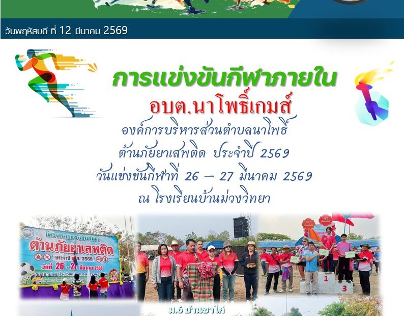 การแข่งขันกีฬาภายใน องค์การบริหารส่วนตำบลนาโพธิ์ ต้านภัยยาเสพติด ประจำปี 2569 วันแข่งขันกีฬา วันที่ 26-27 มีนาคม 2569 ณ โรงเรียนบ้านม่วงวิทยาข่าวประชาสัมพันธ์, ประกาศ/หนังสือราชการ/ดาวน์โหลด, ภาพกิจกรรม, ไฮไลท์ Pimraput.ta
