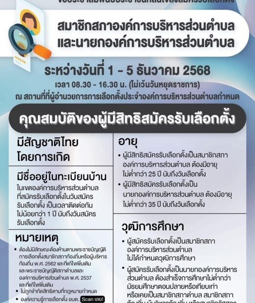 ขอประชาสัมพันธ์ประชาชนที่สนใจลงสมัครรับเลือกตั้ง สมาชิกสภาองค์การบริหารส่วนตำบลเเละนายกองค์การบริหารส่วนตำบล ระหว่างวันที่ 1-5 ธันวาคม 2568ข่าวประชาสัมพันธ์, ไฮไลท์ นางสาวลดาวัลย์ มิเถาวัลย์