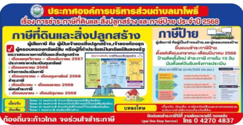 เรื่อง การชำระภาษีที่ดินและสิ่งปลูกสร้าง และภาษีป้าย ประจำปี 2568ข่าวประชาสัมพันธ์, ประกาศ/หนังสือราชการ/ดาวน์โหลด, ไฮไลท์ Pimraput.taภาษ๊ที่ดิน ล่าสุด จำนวนผู้เข้าชม : 41 FacebookFacebookXXLINELinepreviousประกาศองค์การบริหารส่วนตำบลนาโพธิ์ เดือน ธันวาคม พ.ศ.๒๕๖๗nextเรื่อง เผยแพร่แผนการจัดซื้อจัดจ้าง ประจำปีงบประมาณ พ.ศ.๒๕๖๗