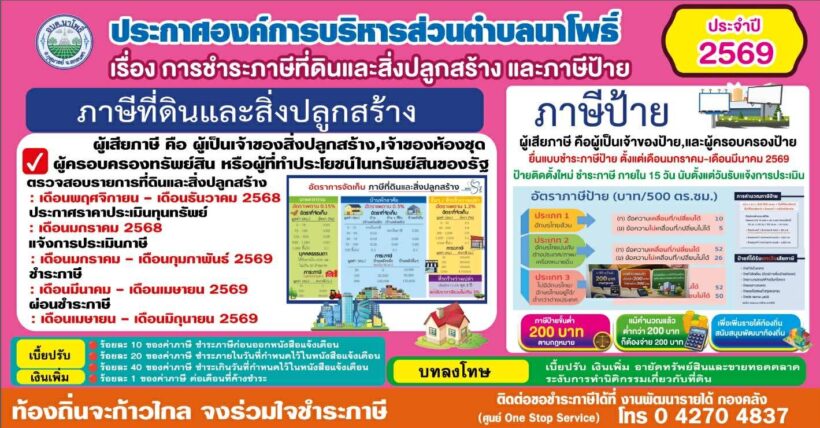 ประกาศองค์การบริหารส่วนตำบลนาโพธิ์ เรื่องการชำระภาษีที่ดินและสิ่งปลูกสร้าง และภาษีป้ายข่าวประชาสัมพันธ์, ประกาศ/หนังสือราชการ/ดาวน์โหลด, ไฮไลท์ Pimraput.ta จำนวนผู้เข้าชม : 24 FacebookFacebookXXLINELinepreviousประกาศผู้ชนะการเสนอราคา ฯ องค์การบริหารส่วนตำบลนาโพธิ์nextเรื่อง สรุปผลการดำเนินการจัดซื้อจัดจ้าง ประจำเดือน มกราคม พ.ศ.2569